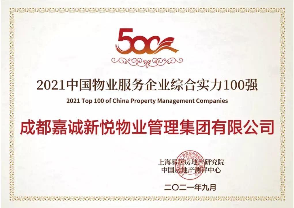嘉诚新悦集团连续四年蝉联“2021物业服务企业综合实力100强”,并荣获“2021中国物业服务市场化运营领先企业”、“2021中国写字楼物业服务领先企业”称号